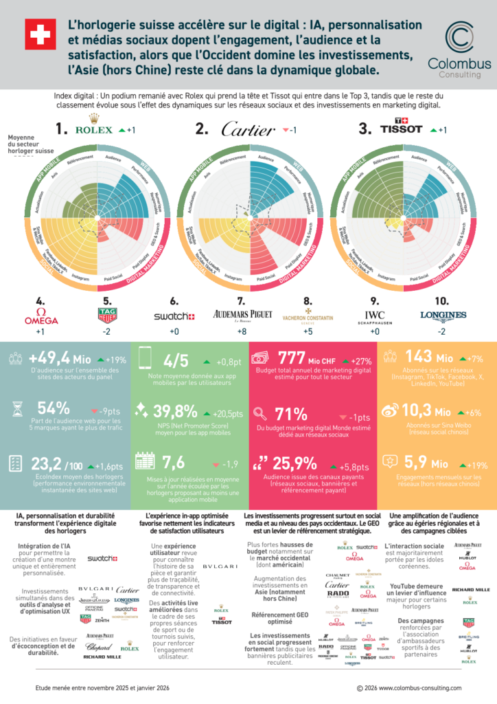 Après une année 2025 en demi-teinte, le secteur horloger retrouve une dynamique soutenue avec une audience web en hausse (+19 %), portée par la résilience des marchés occidentaux et de l’Asie (hors Chine). L’expérience sur les applications mobiles, l’intelligence artificielle et le GEO (Generative Engine Optimization) deviennent des leviers de différenciation stratégiques. Toutefois, l’industrie doit encore relever le défi de l’éco-conception numérique pour aligner ses performances digitales avec ses engagements RSE.