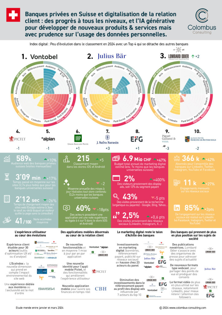 Colombus Consulting publie la 4ème édition de son étude sur la digitalisation de la relation client des banques privées suisses, réalisée avec un panel de près de 30 acteurs majeurs du secteur. L’étude relève que l’explosion de l’IA entraine des évolutions de plus en plus rapides. Il est encore temps et plus que nécessaire pour les banques privées de se mettre en ordre de bataille pour faire faces aux nouveaux enjeux digitaux qu’elle entraîne.